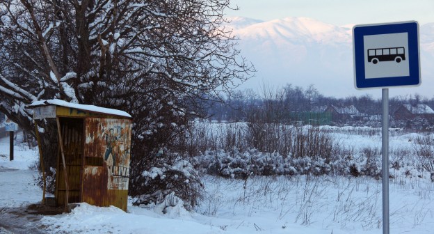 Bus stop with stunning views of the mountains of Kosovo.